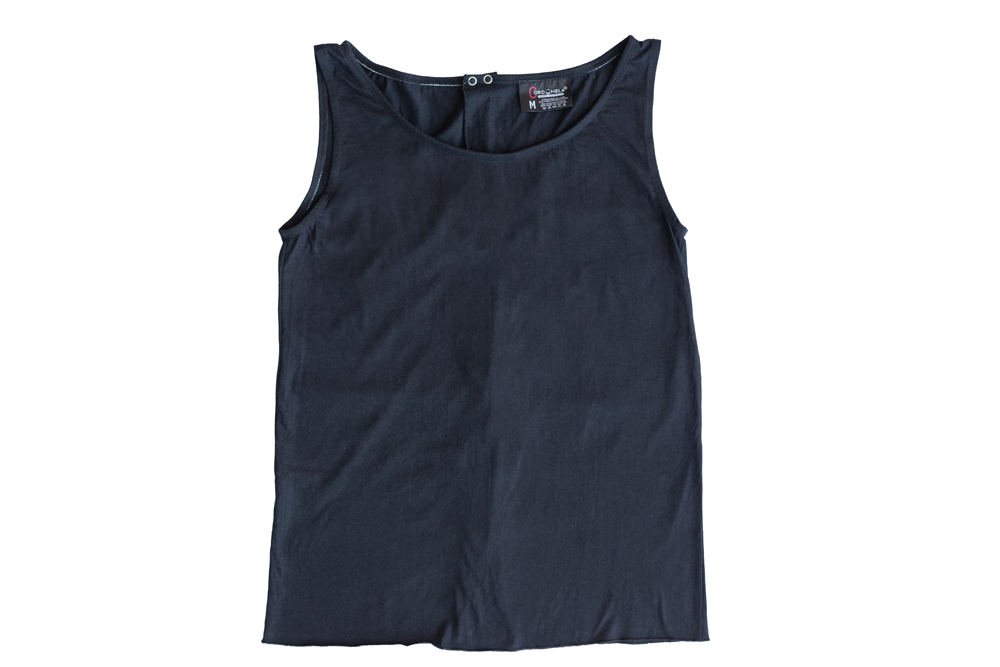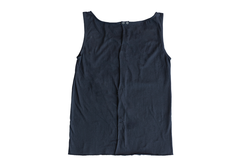 Camiseta interior de sisa, cuello redondo, que se abrocha con broches a presión y velcro por la espalda.