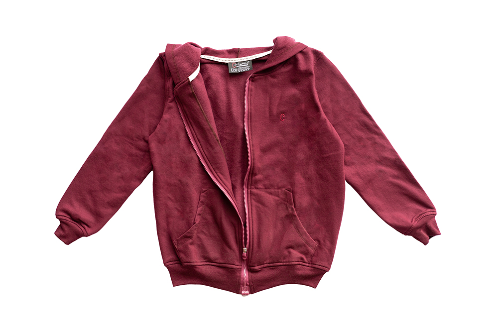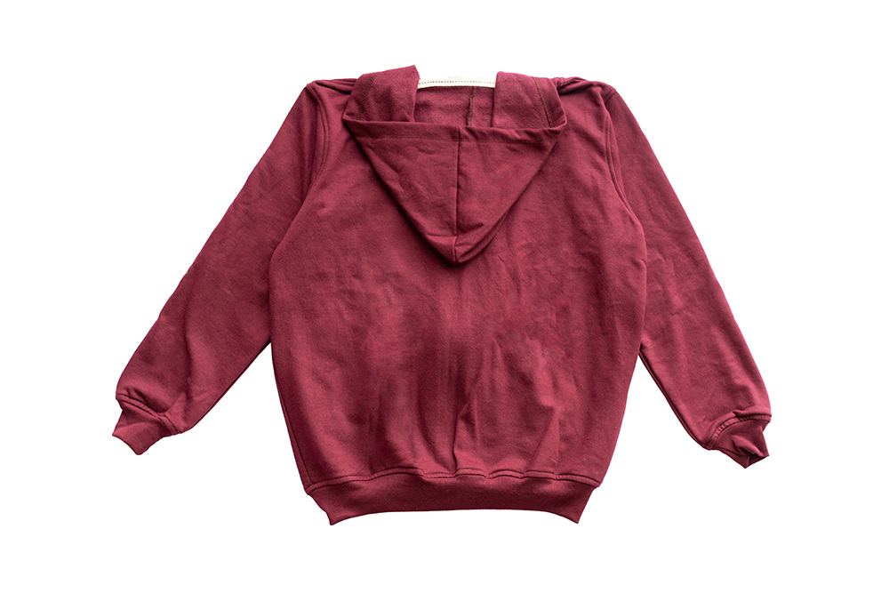 Sudadera con gorro y cierre magnético color vino.