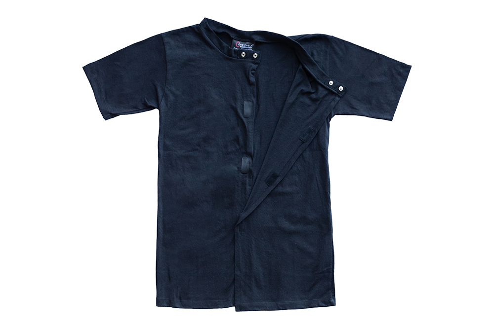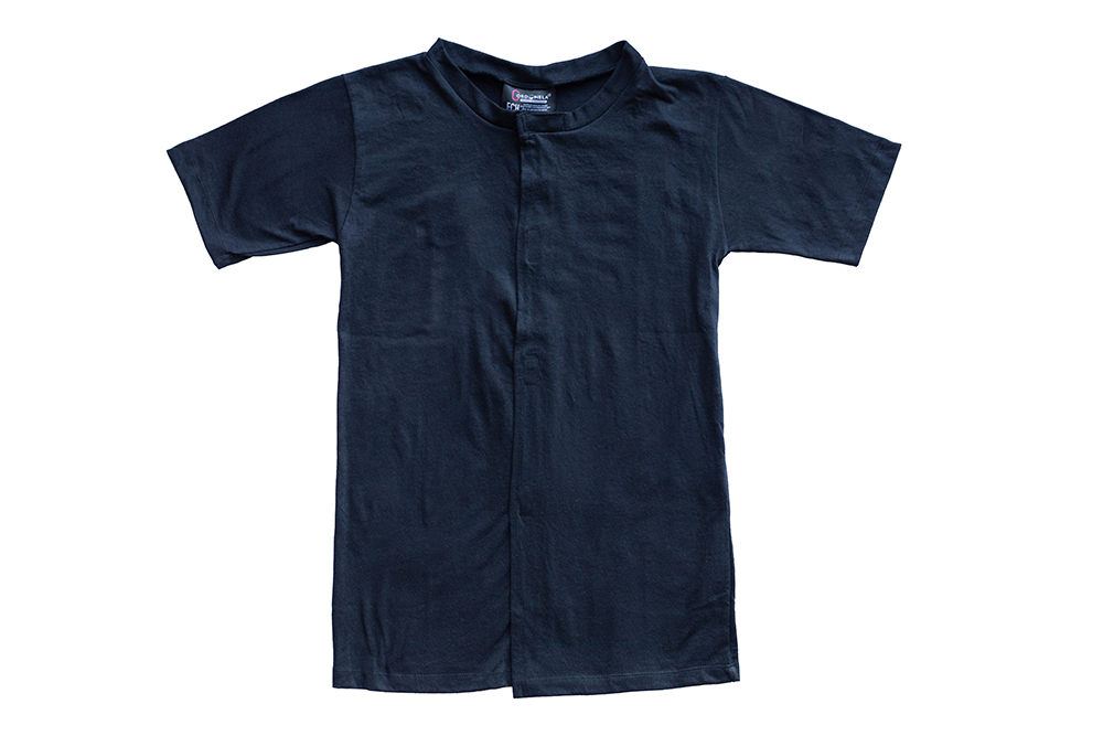 Camiseta interior con mangas cortas, cuello redondo y se cierra con velcro en la línea del cuello y velcro a lo largo del frente de la camisa.