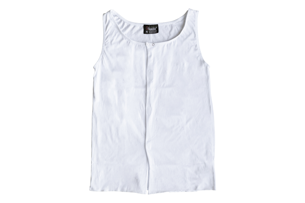 Camiseta interior de sisa, cuello redondo, abierta por el frente y se abrocha con broches a presión en la línea del cuello y velcro a lo largo del frente de la camiseta.
