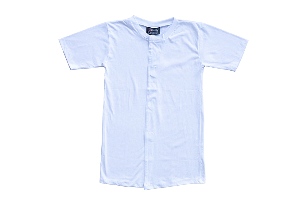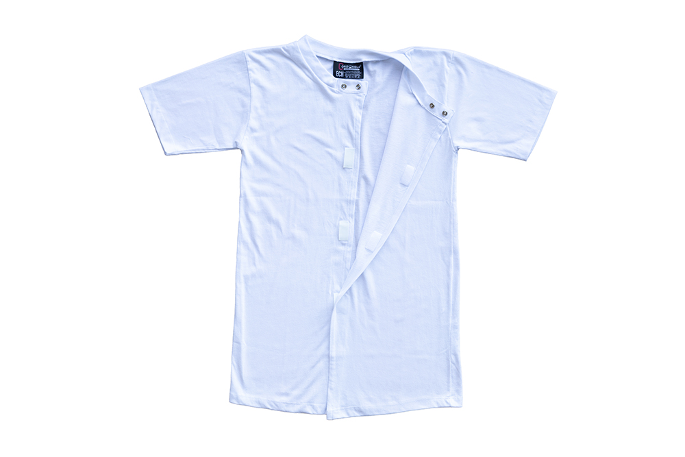 Camiseta interior con mangas cortas, cuello redondo y se cierra con velcro en la línea del cuello y velcro a lo largo del frente de la camisa.
